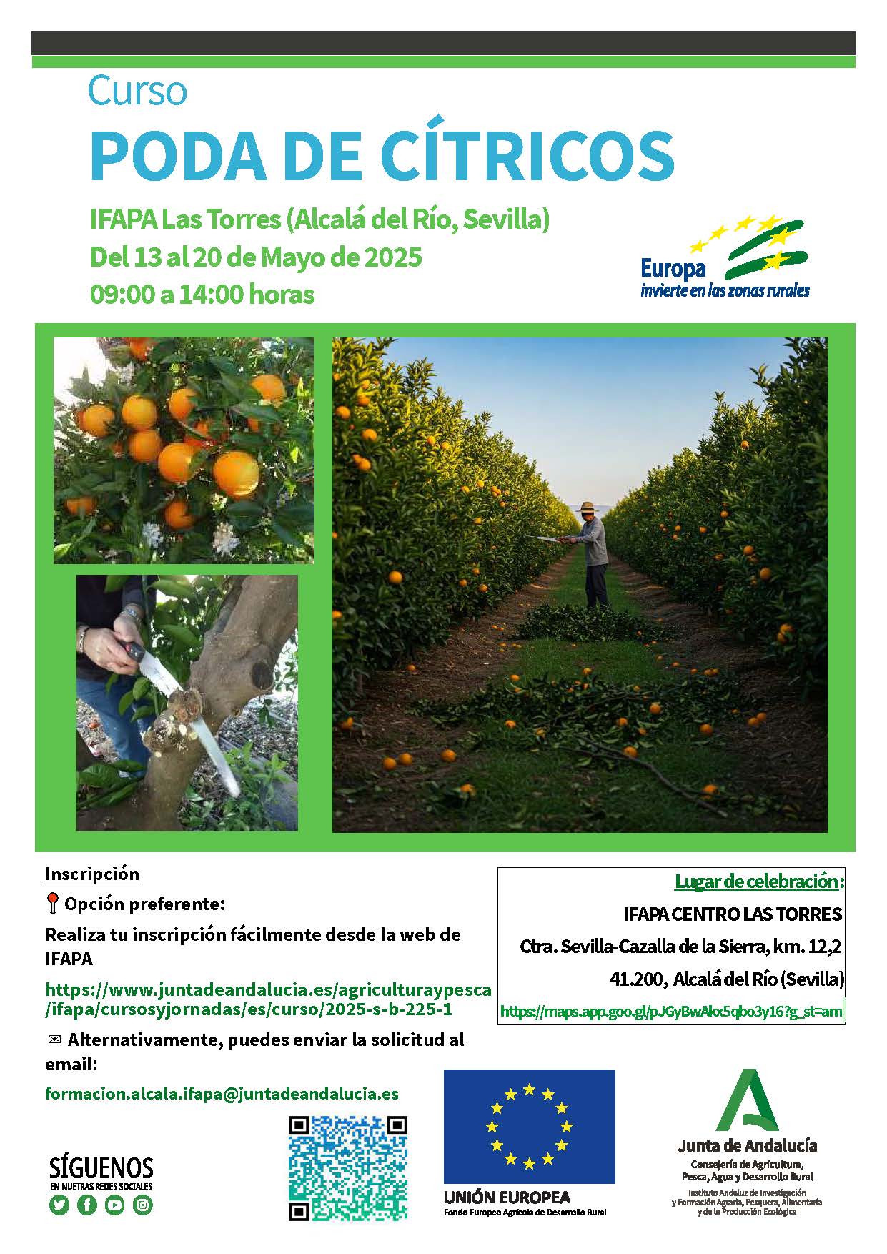 Por si fuera de su interés le informamos que el próximo día 13 de mayo de 2025 dará comienzo en el IFAPA Centro Las Torres la actividad formativa "PODA DE CÍTRICOS".