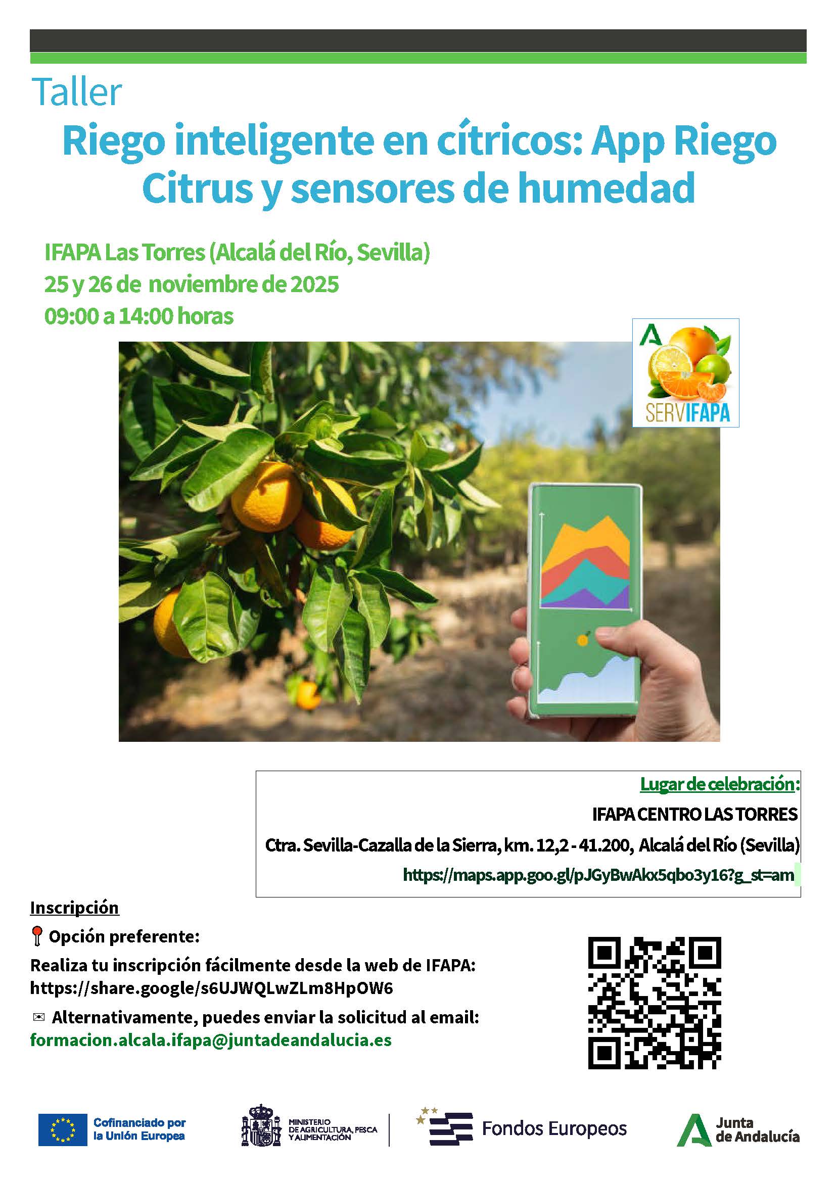 Por si fuera de su interés, le informamos que el próximo día 25 y 26 de noviembre de 2025 se celebrará en el IFAPA Centro Las Torres el taller formativo "RIEGO INTELIGENTE EN CÍTRICOS: APP RIEGO CITRUS Y SENSORES DE HUMEDAD.".