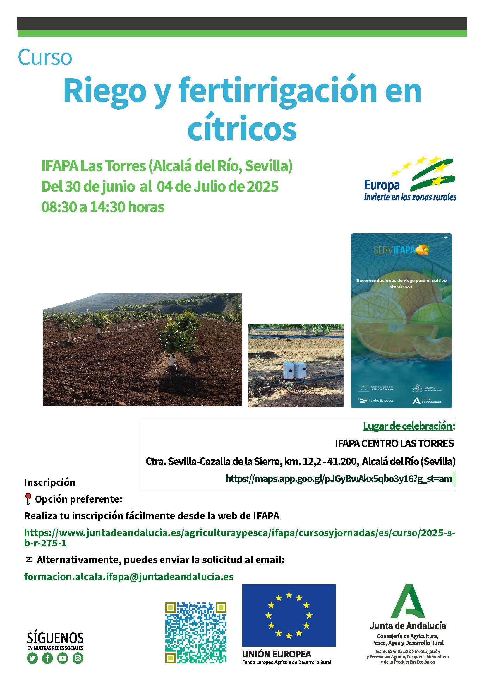 Por si fuera de su interés, le informamos que el próximo día 30 de junio de 2025 dará comienzo en el IFAPA Centro Las Torres la actividad formativa "RIEGO Y FERTIRRIGACIÓN EN CÍTRICOS".