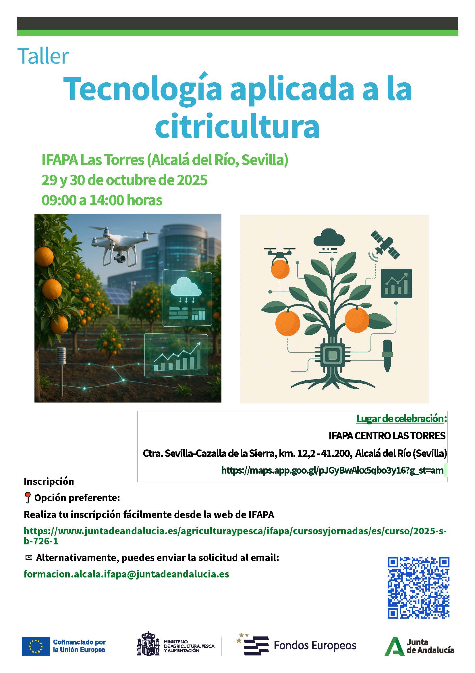 Por si fuera de su interés, le informamos que el próximo día 29 de octubre de 2025 dará comienzo en el IFAPA Centro Las Torres la actividad formativa "TECNOLOGÍA APLICADA A LA CITRICULTURA".