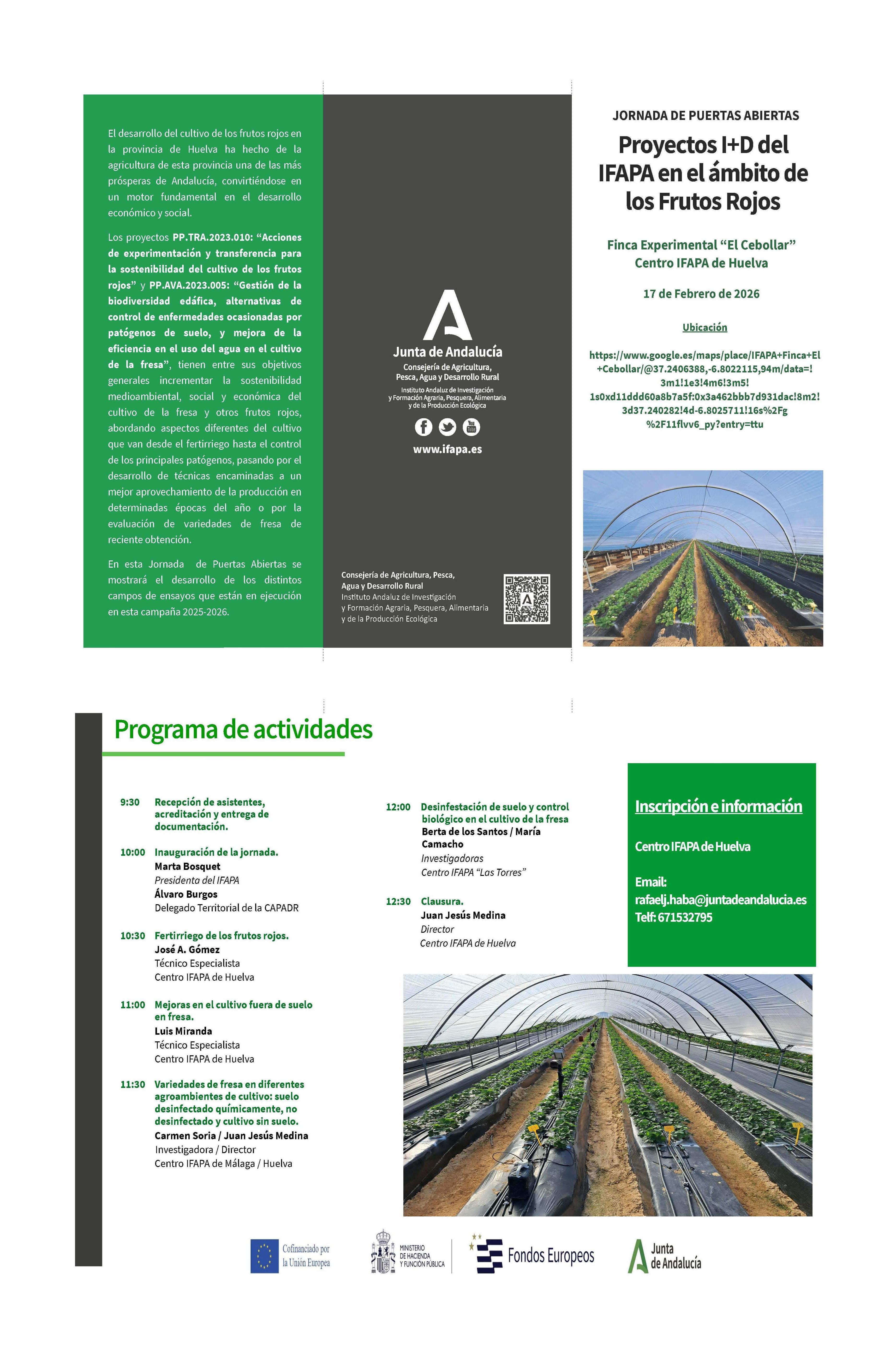 Por si fuera de su interés, le informamos que el próximo martes 17 de Febrero a las 9:30, se celebrará una Jornada de Puertas Abiertas en la Finca Experimental "El Cebollar" (Moguer, Huelva) titulada: "Proyectos I+D del IFAPA en el ámbito de los Frutos Rojos". Esta actividad se encuentra contemplada dentro de los Proyectos de Líneas Estratégicas del IFAPA: “Acciones de experimentación y transferencia para la sostenibilidad del cultivo de los frutos rojos (PP.TRA.2023.010)” y "Gestión de la biodiversidad edáfica, alternativas de control de enfermedades ocasionadas por patógenos de suelo, y mejora de la eficiencia en el uso del agua en el cultivo de la fresa (PP.AVA.2023.005)".