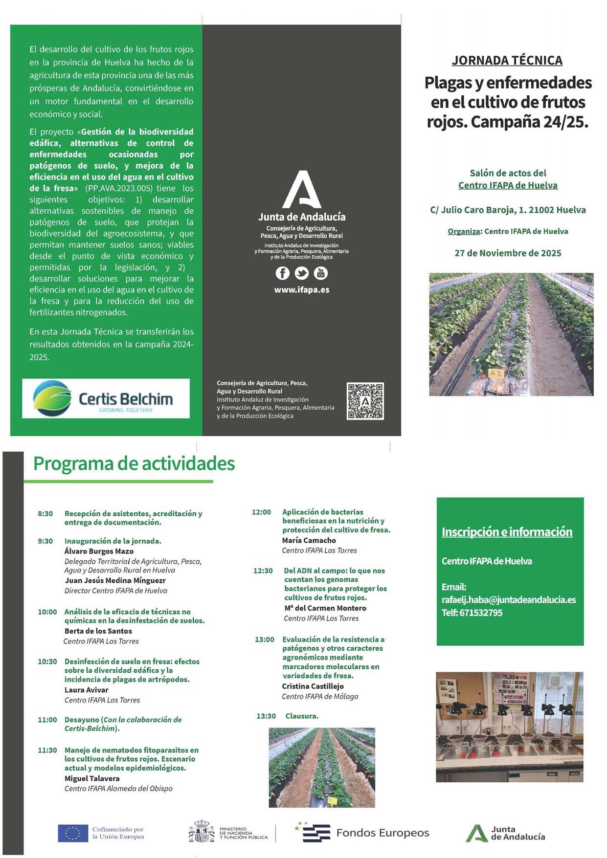 Por si fuera de su interés le informamos que el próximo día 27 de noviembre a las 8:30, tendrá lugar la Jornada Técnica: "Plagas y enfermedades en el cultivo de frutos rojos. Campaña 24/25", que se celebrará en el Salón de Actos del Centro IFAPA de Huelva. Esta actividad se encuentra contemplada dentro de otro Proyecto de Líneas Estratégicas del IFAPA en frutos rojos: "Gestión de la biodiversidad edáfica, alternativas de control de enfermedades ocasionadas por patógenos de suelo, y mejora de la eficiencia en el uso del agua en el cultivo de la fresa (PP.AVA.2023.005)".